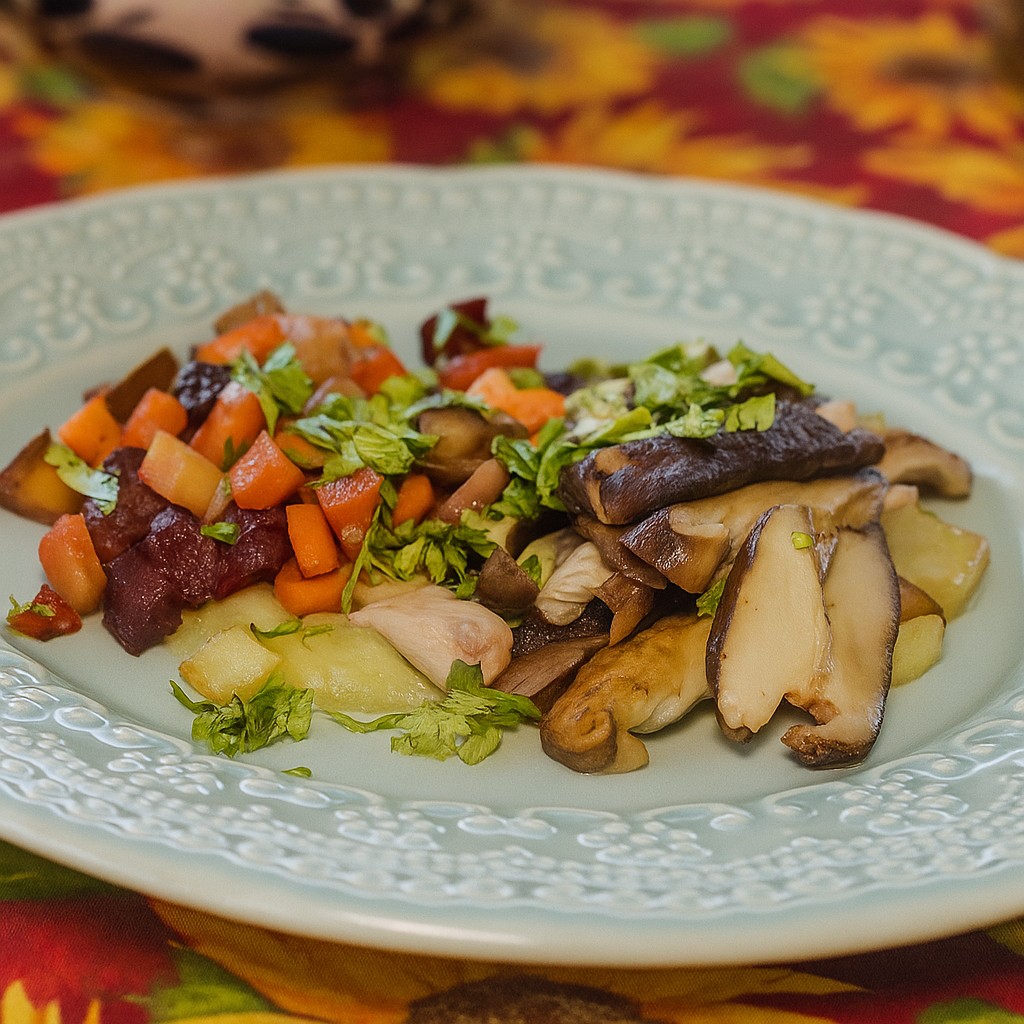 Higienizar e cortar os cogumelos de maneira uniforme ao seu gosto. Em uma frigideira com pouco azeite de oliva aquecido, colocar os cogumelos cortados para grelhar, de preferência uma frigideira grande para que não fiquem sobrepostos. Manter em fogo alto até que estejam prontos. montagem e finalização No centro do prato, colocar duas colheres de sopa do purê. Em uma das metades do prato colocar os legumes assados e na outra metade, os cogumelos. Decorar com os brotos de coentro (em cima do purê).